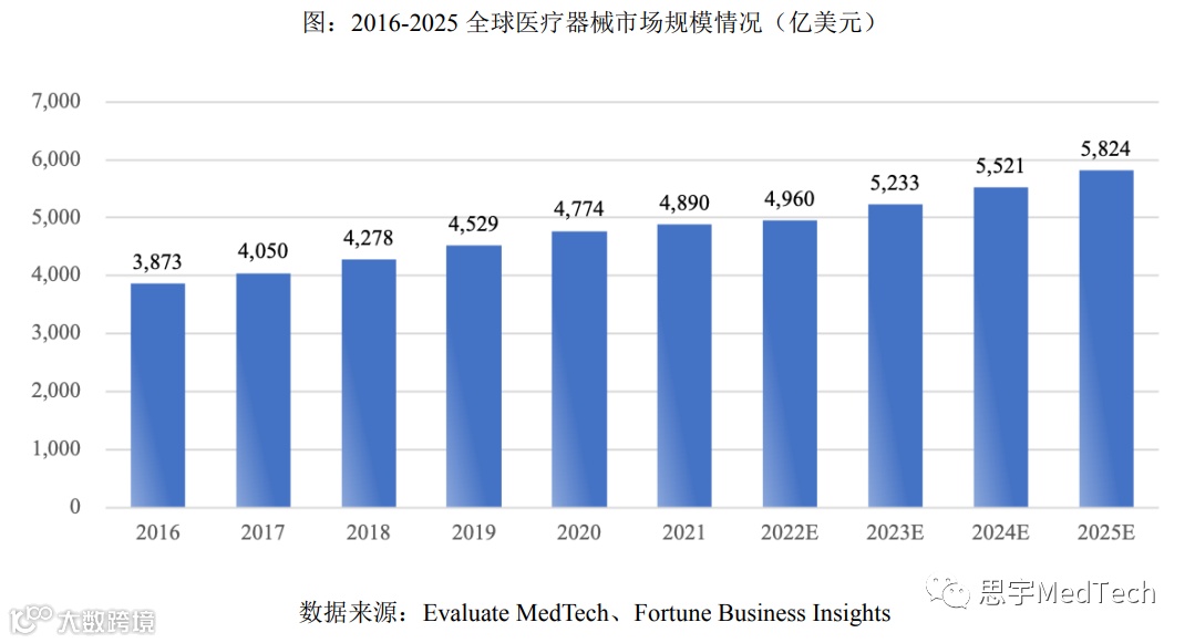 随着全球人口自然增长和人口老龄化程度提高,医疗健康行业的需求将持续提升。发展中国家的经济增长也提高了其国内居民的消费能力,支撑全球范围内医疗器械市场持续保持增长趋势。根据《财富》商业观察(Fortune Business Insights)的数据,2021年全球医疗器械市场规模为4,890亿美元,预计2022年增至4,960亿美元,未来将以5.5%的年复合增长率增长,预计2025年超过5,800亿美元,2029年增至7,190亿美元左右。