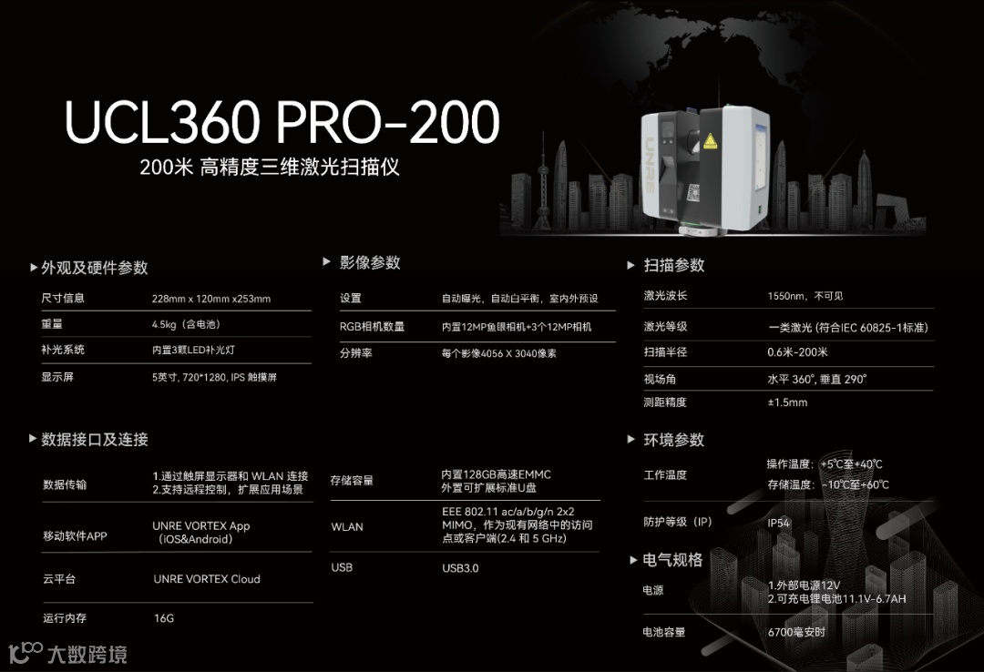 UCL360 PRO系列提供毫米级测量精度,满足建筑测量、逆向工程和文物保护等高精度场景需求。其中,UCL360 PRO 100的扫描半径为100米,UCL360 PRO 200可达200米,两款产品均具备±1.5mm的测量精度,助力用户在复杂环境中实现精准数据采集。