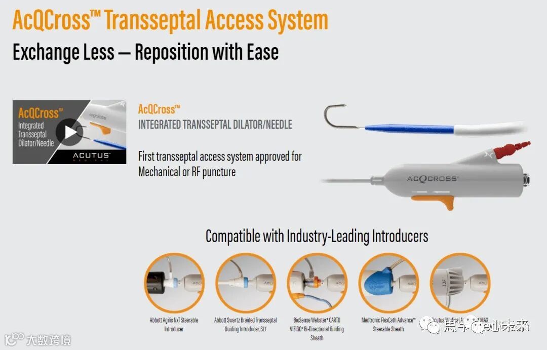 Acutus Medical的左心通路产品组合包括:AcQCross系列与鞘管兼容的隔膜穿越装置,AcQGuideMini集成穿越装置和鞘管,带有经隔膜扩张器和针头的AcQGuideFlex可转向导引器,以及AcQGuideVue可转向鞘管。