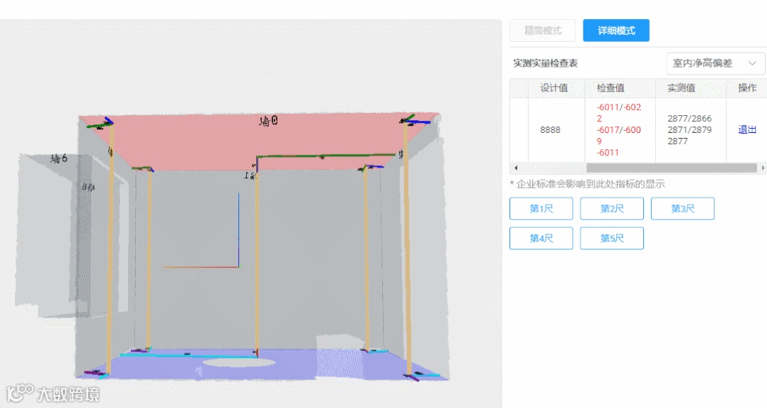 全墙面测量以整体墙面数据检测来量化反映施工质量,并以正负测量值来帮助人工进行墙面整改,整改人员即可轻松找到相应墙面的爆点位置便于安排整改。