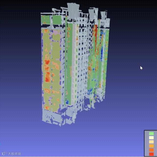 使用三维激光扫描仪对楼体外墙外立面测量,扫描后可通过拼接、立面分割、楼层标注和云计算得到测量结果。以此结果来分析外立面的平整度和垂直度合格情况,这样不仅能提高效率,还能实现结构化数据留存,不断提高品质标准。