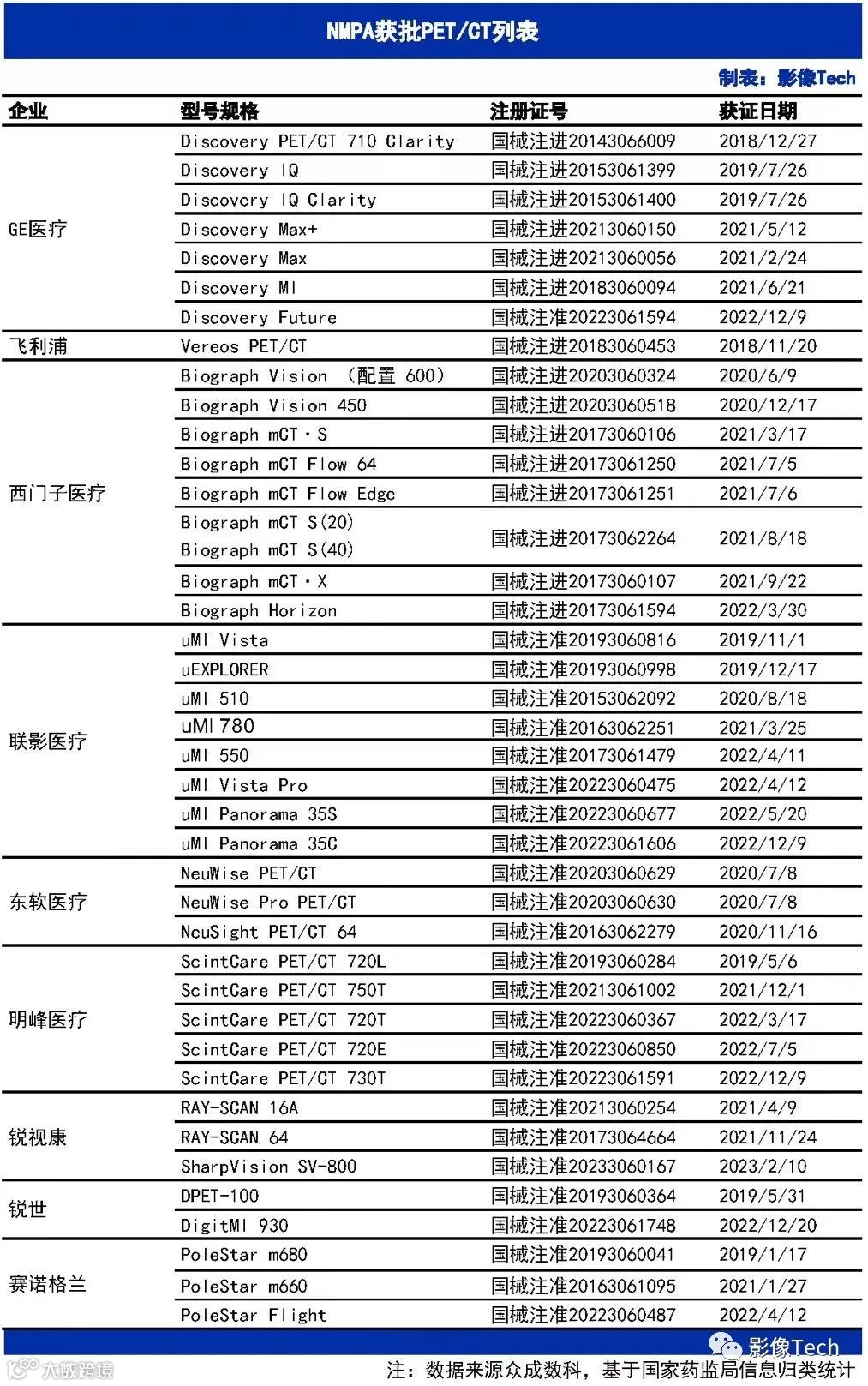 PET/CT让肿瘤诊治进入了分子时代,被誉为“癌症早筛利器”。截至2023年5月10日,NMPA数据显示有9家企业共40款PET/CT注册证在有效期内。随着核医学“一县一科”政策的推出,作为主力核医学设备的PET/CT有望迎来蓬勃发展。