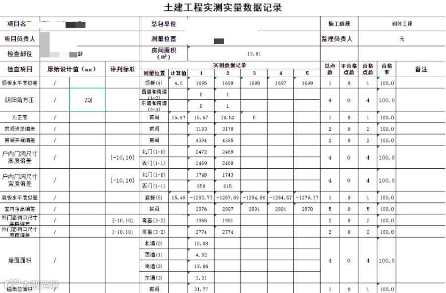 人工复测:每个阶段抽查几个房间,所有项都进行复核,重点复核各个阶段实测的项,按照我们设备的下尺位置进行复核,按照设备值、人工值、误差进行记录,晚上对当天的复核数据做整理记录。