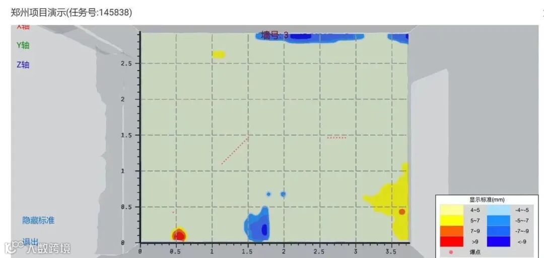 以整体墙面数据监测来量化的反映施工质量,并以不同的颜色来显示出爆点区域从而帮助人工进行墙面整改。