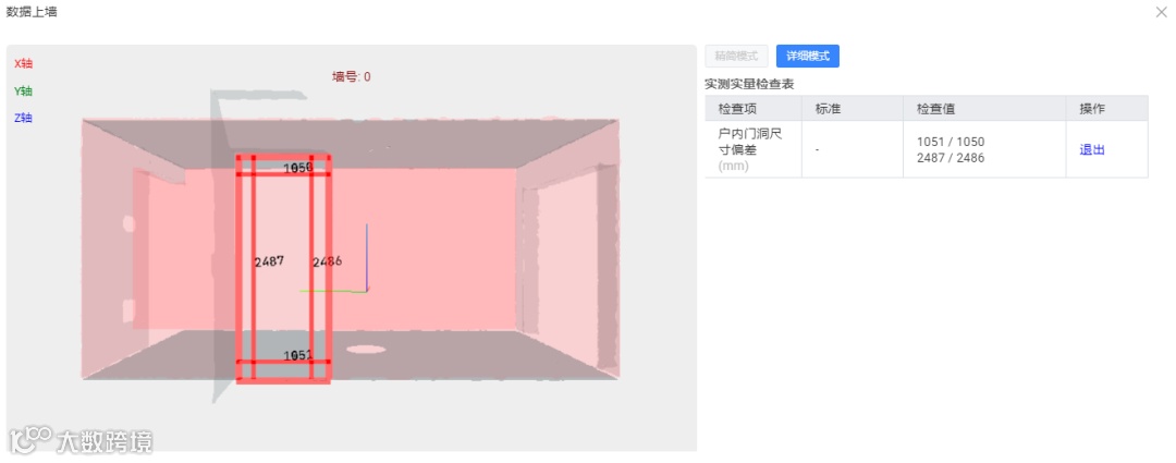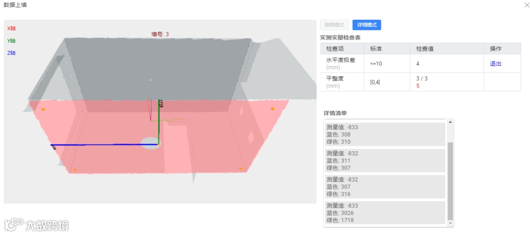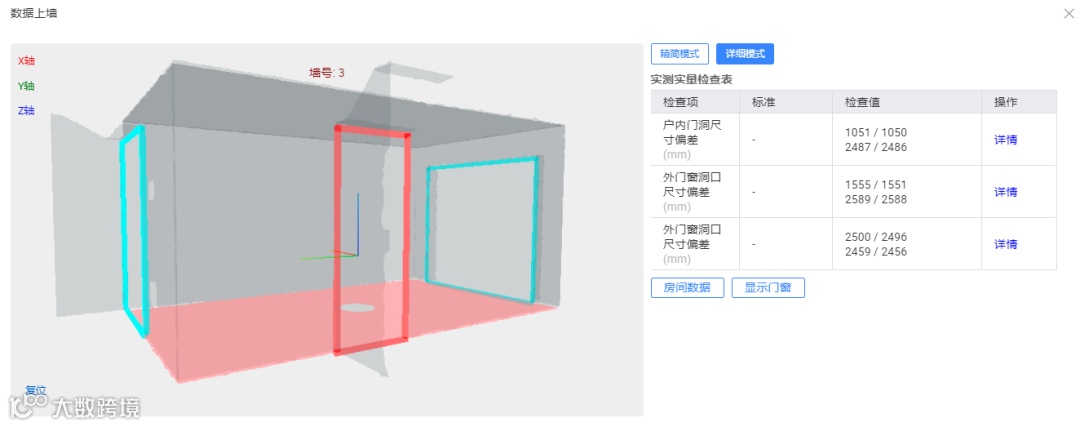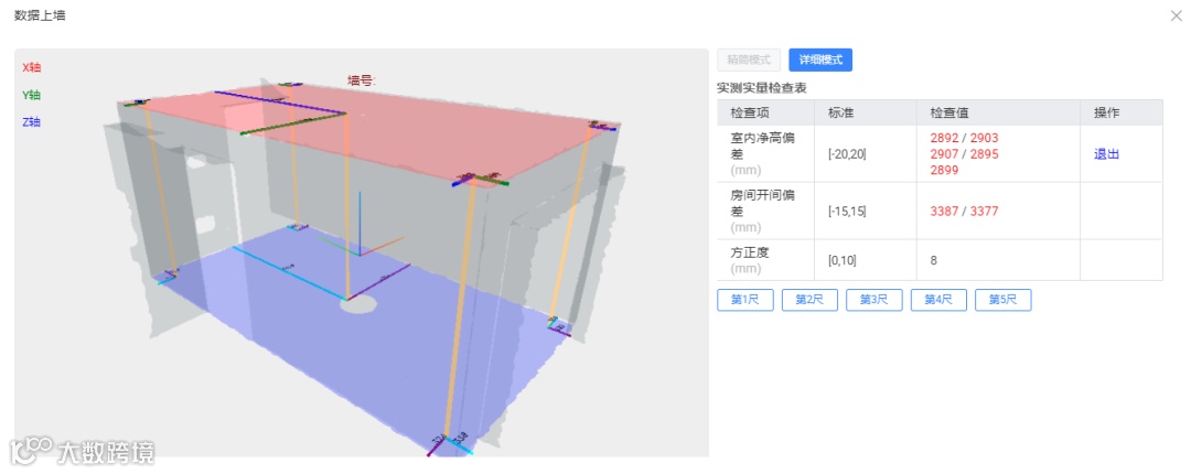 扫描获取3D房间模型,便于直接查看每面墙的数据,因此“数据上墙”真实可靠,数据可以长时间保存云端,便于追溯。