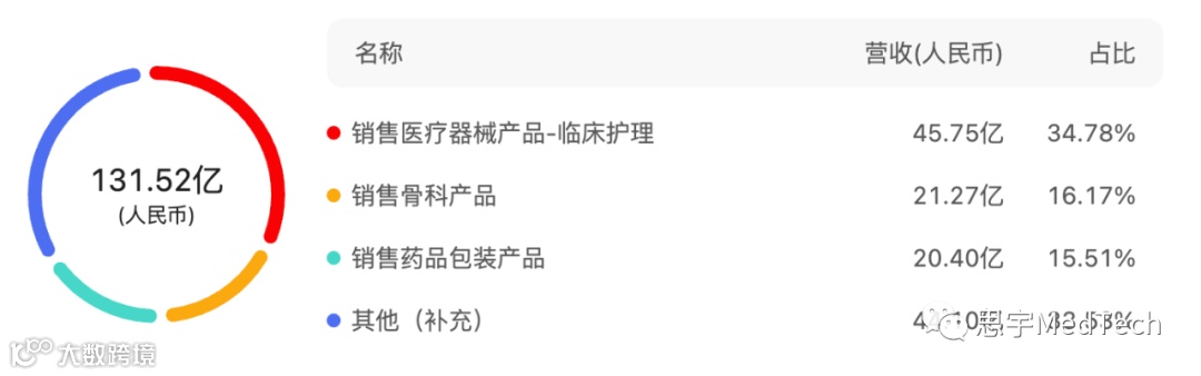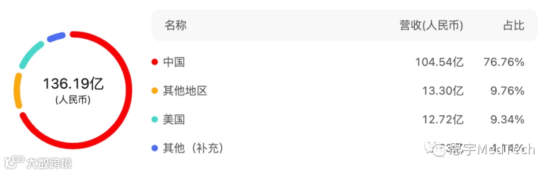 2022年,威高集团总营收达到136.19亿元,同比增长3.55%,其中收入业务、产品、地区占比情况分别如下图所示: