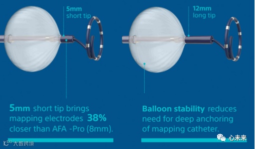 此外,冷冻球囊(POLARx)拥有两种规格,分别是POLARx ST和POLARx LT。两种规格不同在于头端长度不一样,一个为5mm,一个为12mm。5mm的短尖端使测绘电极比AFA-Pro(8mm)近38%。