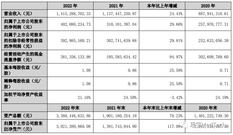 2022年公司实现营业收入14.15亿元,同比增长24.43%;实现归属于上市公司股东的净利润4.02亿元,同比增长29.66%。利润和收益的增长得益于公司的销售规模的扩大,技术及管理水平的提升。
