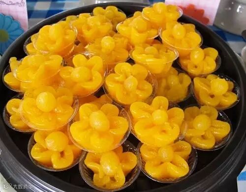 豆蓉果是将绿豆蓉捏成个钟形状,涂上颜色,然后镀上漂亮的琼脂。豆蓉果所使用的颜色除了能在捏成形的豆蓉上涂,还能直接融入豆蓉中成色。