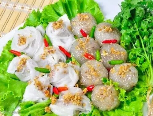 这是一种用糯米粉水皮包裹猪肉内馅搭配另一种用像西米露的外皮,同样包着猪肉的咸甜点心,泰国人多半会混着油葱、辣椒一起食用。