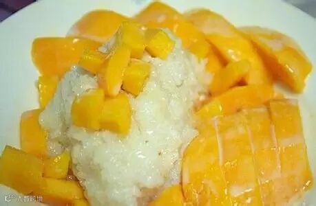 糯米饭是一道经典的泰国甜品。芒果甜中带点酸,可在转瞬间被软、黏、韧的泰国椰香糯米饭的甜味融化掉——椰浆、糯米饭的甜蜜与芒果的清香,在嘴里悠悠地融化开来——心也要化了哦。