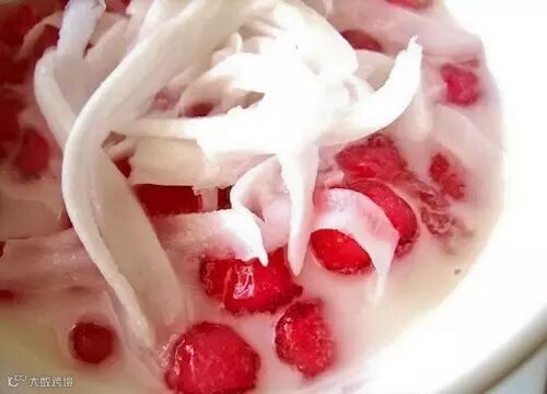 用木薯粉包裹了荸荠丁,在糖水中煮熟之后做成红色的小丸子,然后和白色的椰蓉浸泡在椰浆里,每一粒都散发出诱人的光泽。