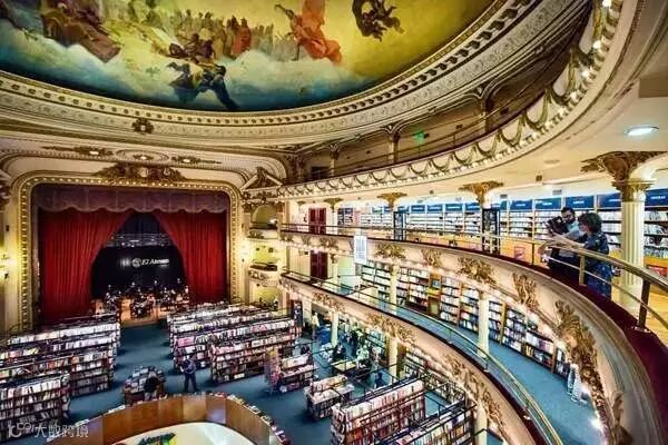 雅典人书店,它由一个剧院改造而来,原有的包厢、雕刻、戏台上的深红色幕布全都保留了下来,穹顶上是由由意大利画家萨纳雷诺?奥兰迪绘制壁画,古老而堂皇,是全球第二大书店。