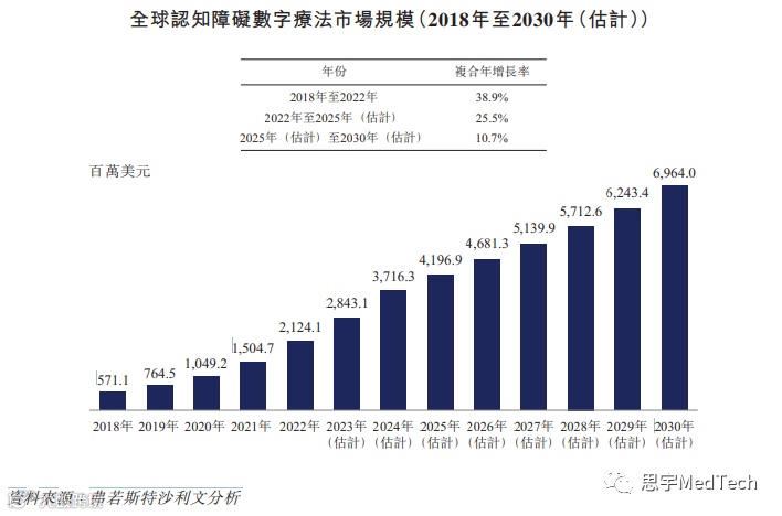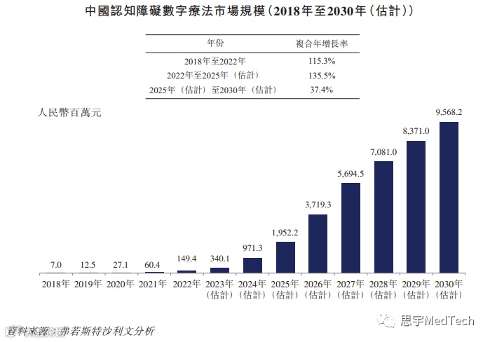据公司招股书,2022年,全球认知障碍数字疗法的市场规模达到21亿美元,预计2025年将增至42亿美元,2030年将增至70亿美元,复合年增长率分别为25.5%及10.7%。2022年,中国认知障碍数字疗法的市场规模达到人民币1.49亿元,预计2025年将增至人民币19.52亿元,2030年将增至人民币95.68亿元,复合年增长率分别为135.5%及37.4%。由于认知障碍治疗需求的增加,创新技术的进步,支持性监管措施以及认知障碍数字疗法作为一种治疗选择的意识的增强,认知障碍数字疗法的市场预计将增长。