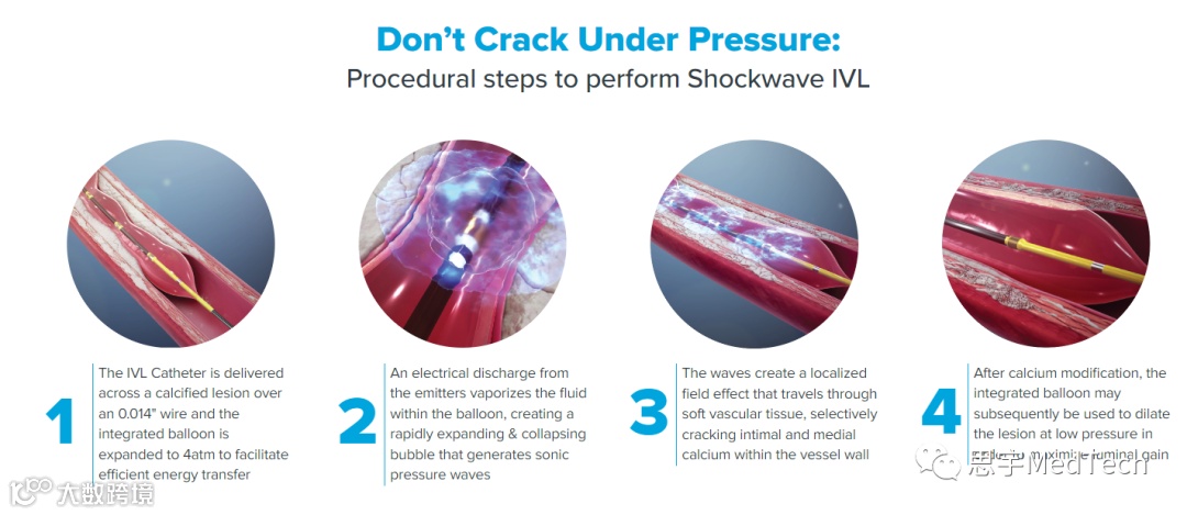 IVL创造性地将治疗肾结石的体外冲击波碎石术应用于血管内,通过球囊导管将声压力波输送至钙化部位,把钙化的斑块“震松”,使血管恢复弹性及血流,重塑病变血管,同时,避免了旋切/旋磨术对血管内壁/内膜的损伤,将对动脉内的创伤降到最低。