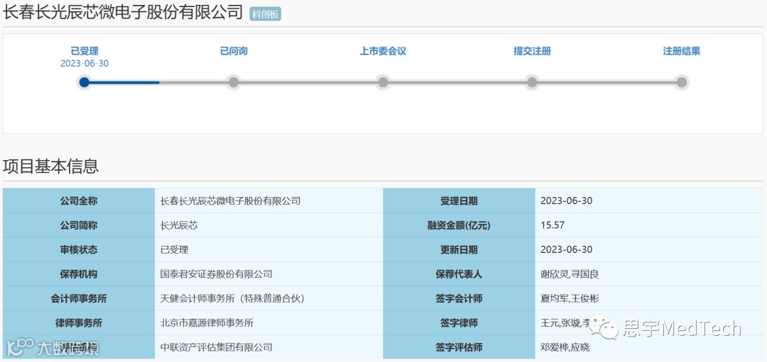2023年6月30日,据上交所官网显示,长春长光辰芯微电子股份有限公司(以下简称:长光辰芯)已提交科创板上市,审核状态为“已受理”。国泰君安证券为其保荐机构。