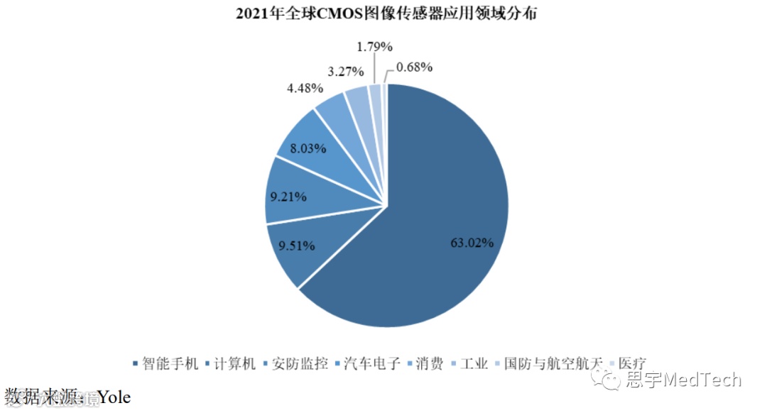据 Yole 统计,CMOS 图像传感器下游应用领域主要包括智能手机、计算机、安防监控、汽车电子、消费、工业(含机器视觉)、国防与航空航天(含科学仪器)和医疗等领域。全球 CMOS 图像传感器应用领域分布如下图所示: