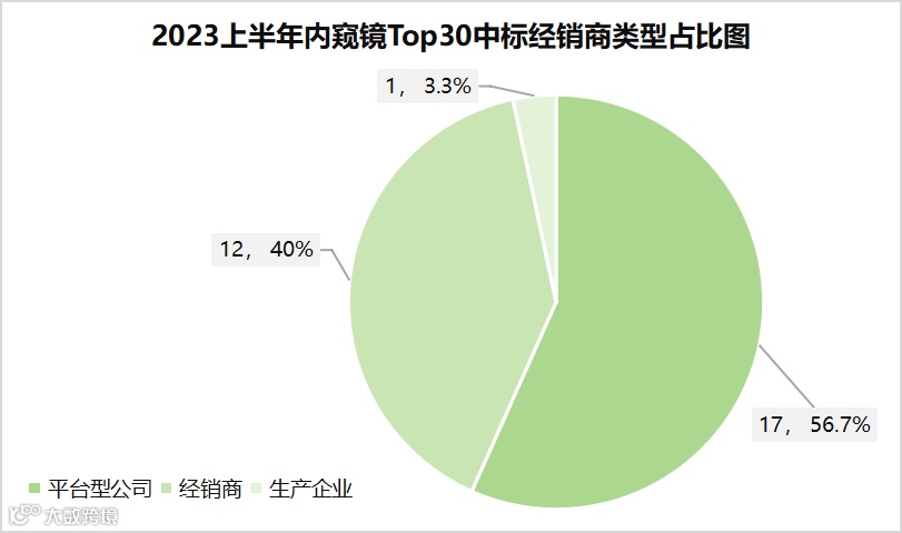 在Top30的中标企业中,平台型企业17家,以37次中标,1.97亿元销售额,占到56.7%的市场份额;经销商企业12家,以18次中标,1.50亿元销售额,占到40%的市场份额。