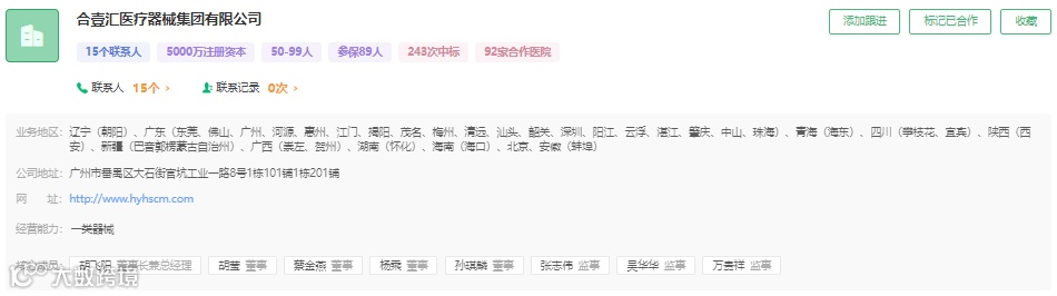 合壹汇医疗器械集团有限公司成立于2013年11月,集团总部位于广东省广州市,目前在全国设有分子公司三十余家,业务覆盖全国32个省、市、自治区及海外50余个国家。