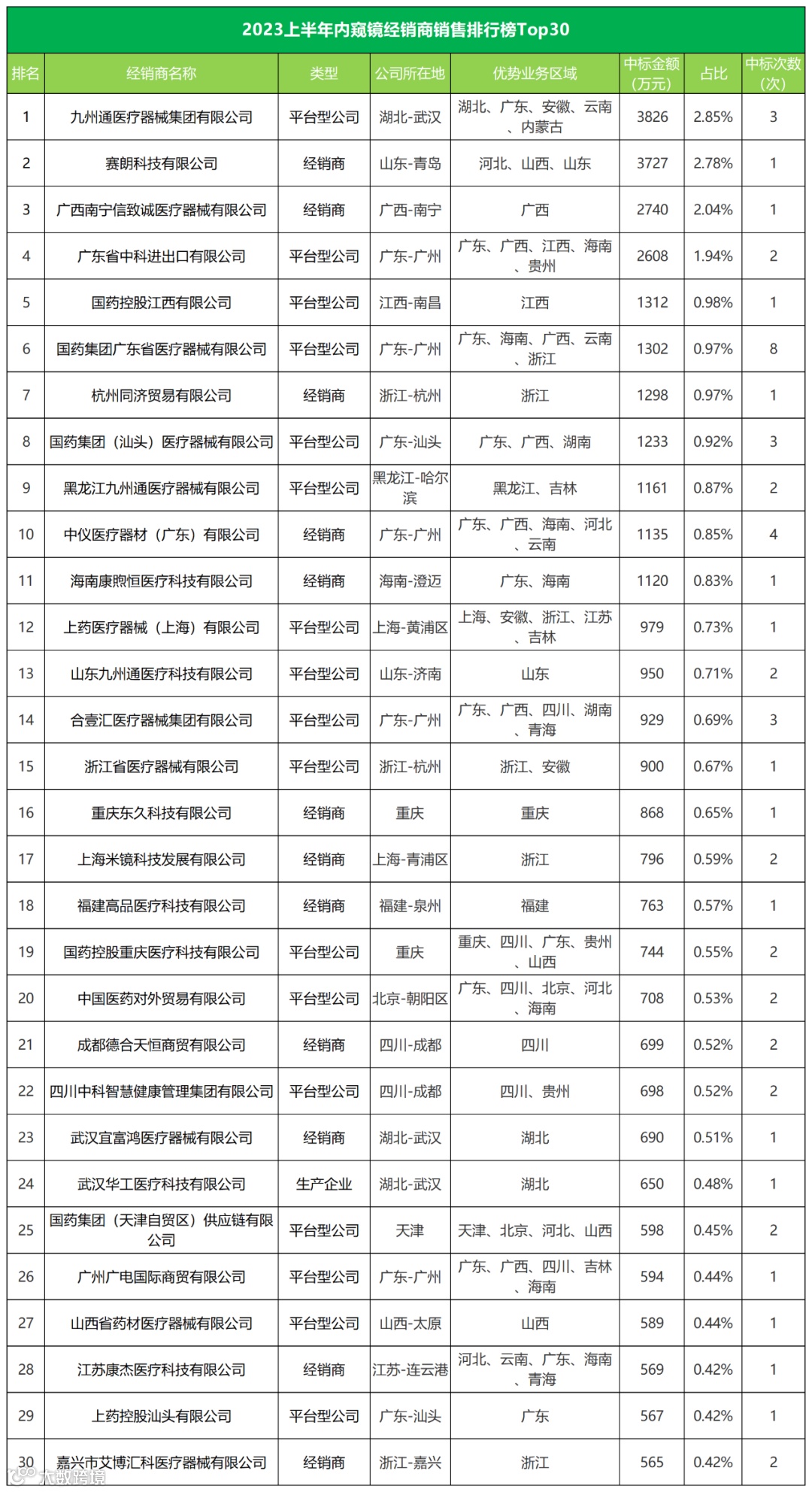2023上半年内窥镜经销商销售排行榜Top30