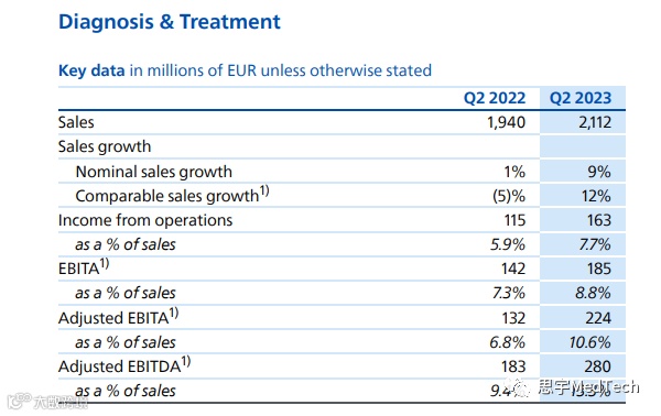医疗业务细分来看:其中,诊断和治疗业务(Diagnosis & Treatment)总营收21.12亿欧元,可比销售额在本季度增长了12%,润率提高至10.6%。其中,超声和图像引导治疗(Ultrasound and Image-Guided Therapy)的销售额增长了两位数,诊断成像的销售额增长了个位数。