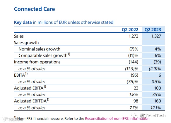 本季度,互联医疗(Connected Care)的总营收13.27亿欧元,可比销售额增长了6%,利润率增加到7.5%,主要得益于中国市场两位数增长的推动,其中监测(Monitoring)业务实现了两位数的增长,部分抵消了睡眠和呼吸护理业务(Sleep & Respiratory Care)的下滑。由于在2020年至2022年期间的强劲增长之后,需求逐渐趋于正常化,可比订单摄入量出现了高个位数的下降,但订单量仍显着高于疫情前。调整后的EBITA利润率增长至7.5%,主要受生产力措施和监控业务盈利能力提高的推动。