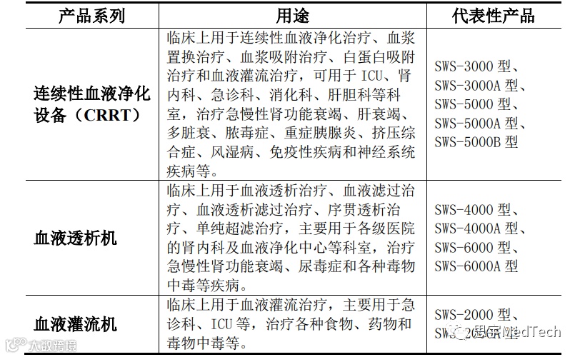 的研发、生产和销售,并提供连锁血液透析医疗服务的国家高新技术企业。公司基于原创性血液净化设备的关键核心技术研发了连续性血液净化设备(CRRT)、血液透析机以及血液灌流机,并自主研发了血液透析浓缩液、血液透析干粉、血液透析器、透析液过滤器、连续性血液净化管路等血液净化耗材,产品广泛应用于治疗各类急慢性肾功能衰竭、尿毒症、多脏器衰竭和中毒等多种病症。