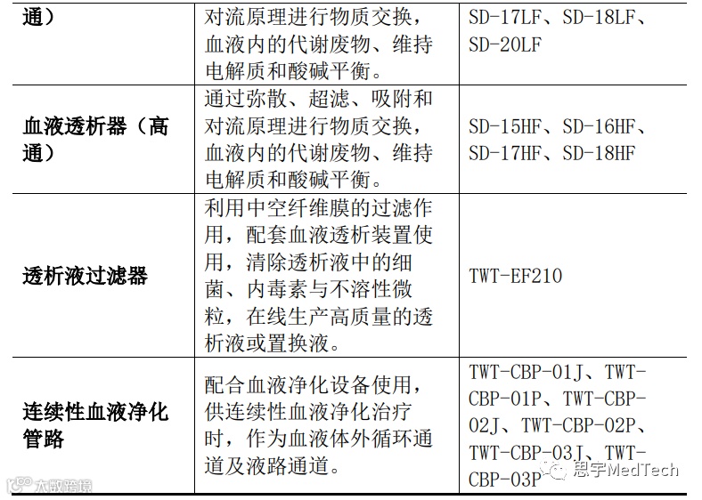 公司下属血液净化耗材已有TWT-Y血液透析浓缩液、TWT-F血液透析干粉、血液透析器(低通)、透析液过滤器、血液透析器(高通)、连续血液净化管路取得了国家第三类医疗器械注册证书,另外,一次性使用血液灌流器已取得注册受理通知书,即将完成自产血液净化耗材的全线布局。