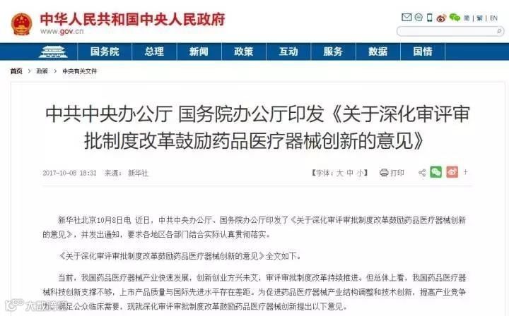 那就是中共中央办公厅和国务院办公厅,两办印发了《关于深化审评审批制度改革鼓励药品医疗器械创新的意见》(以下简称《意见》)。