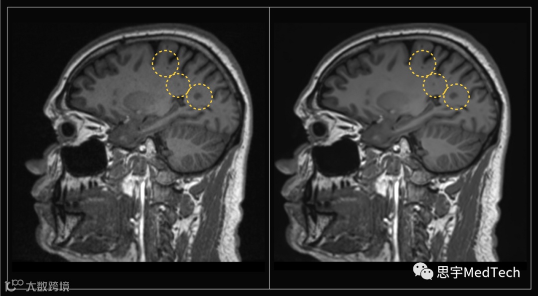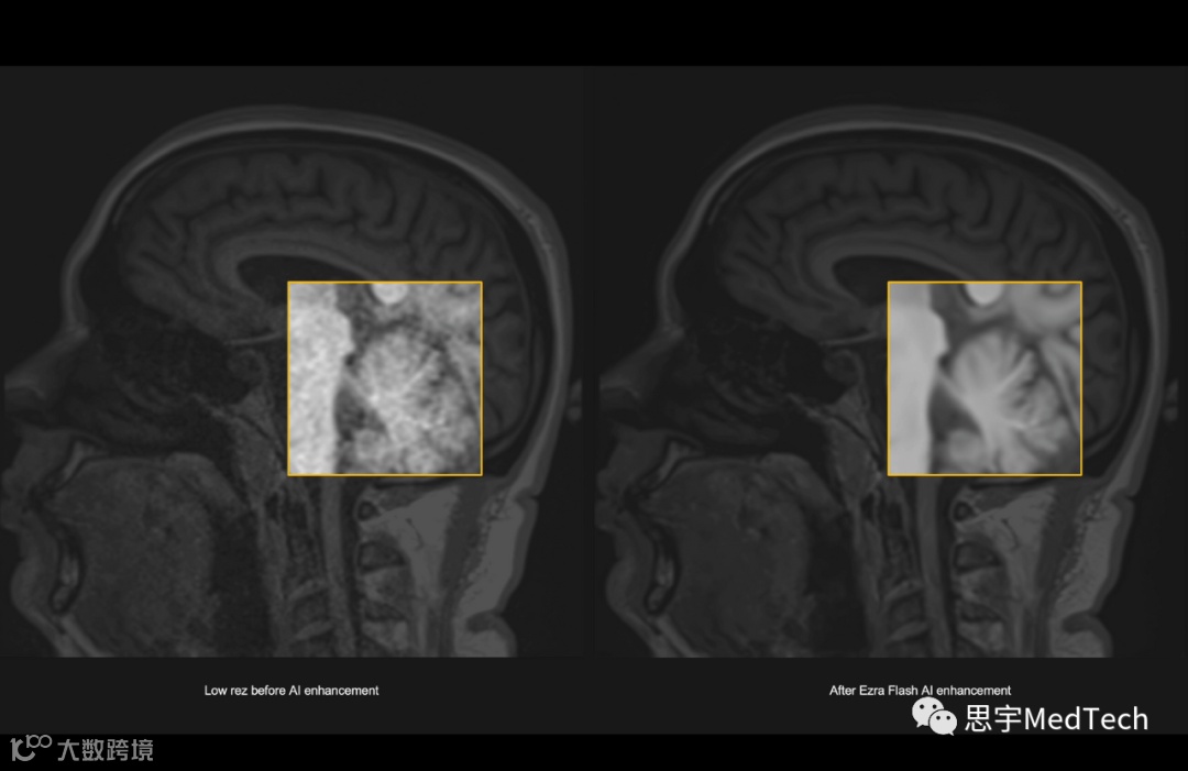 ▲(图左为未使用AI技术形成的MRI图像,图右为Ezra Flash AI增强后图像)