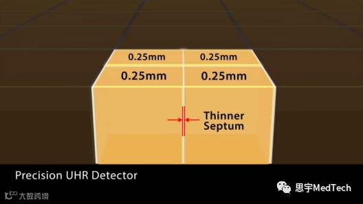 佳能医疗的Aquilion Precision CT采用的是精密 UHR 探测器,0.25 毫米 x 160 行,拥有1792 个通道,一次扫描可采集320 图像,最大旋转速度0.35s。佳能医疗的精密切割技术开发了可光学隔离的离散0.25 mm元件,允许光传输不会发生串扰。再加上闪烁体效率,检测器电路和其他DAS组件的显着改善,探测器剂量效率显著提高。