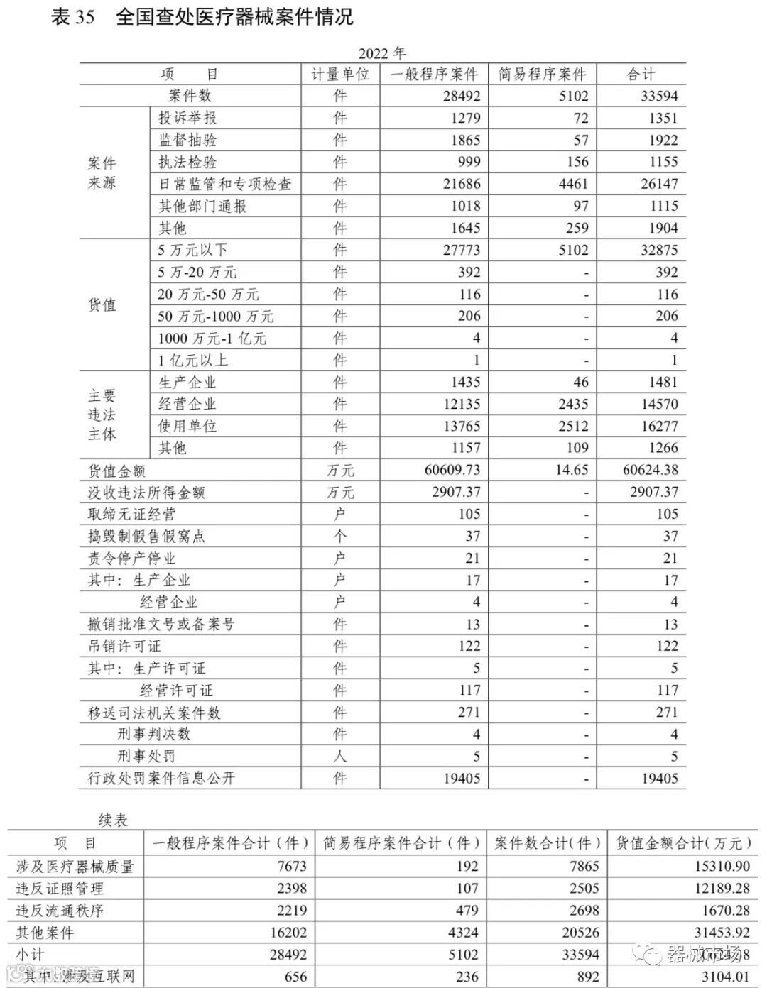 2022年,全国共查处医疗器械案件33594件,货值金额60624.38万元,较2021年分别增加22.89%和7.83%。移送司法机关271件,是2021年的3.99倍。
