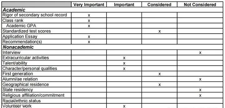 班级排名、课外活动和天赋/能力对招生委员会来说“很重要”。“考虑”的因素包括志愿者工作、第一代身份、州居住权、地理居住地、遗产身份、种族和有偿工作经验。