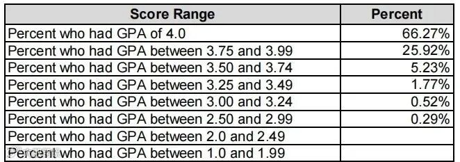 再从绝对值看,JHU也非常大方地展现了GPA的区间。66.27%的学生GPA达到4.0,25.92%的学生GPA在3.75-3.99区间,5.23%的学生GPA在3.5-3.74之间,剩下的比例基本可以忽略不计。对于亚裔学生,如果要申请JHU,JHU最好保持在3.9.