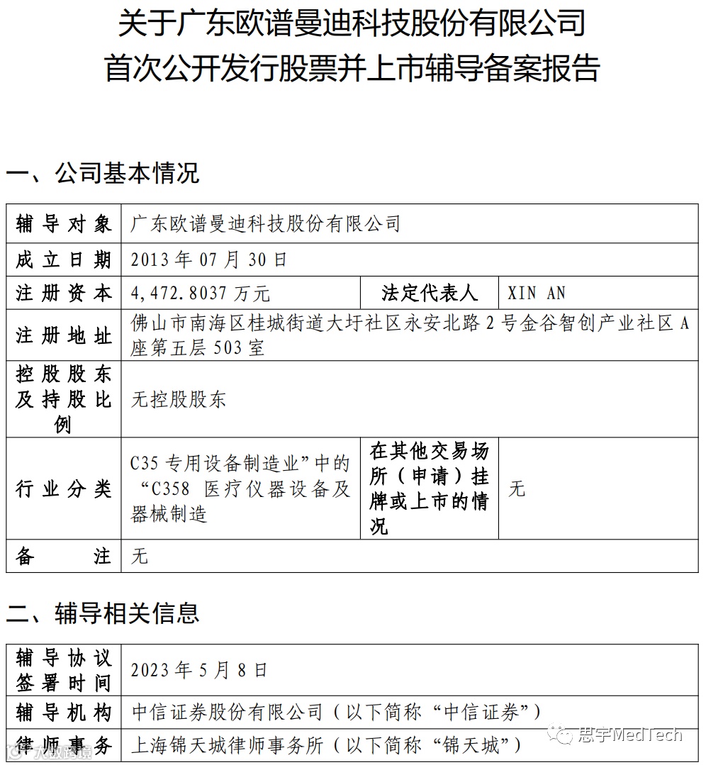 2023年5月23日,据证监会官网显示,广东欧谱曼迪科技股份有限公司(以下简称:欧谱曼迪)上市辅导备案登记获证监局受理,辅导机构为中信证券,派出机构为广东证监局。