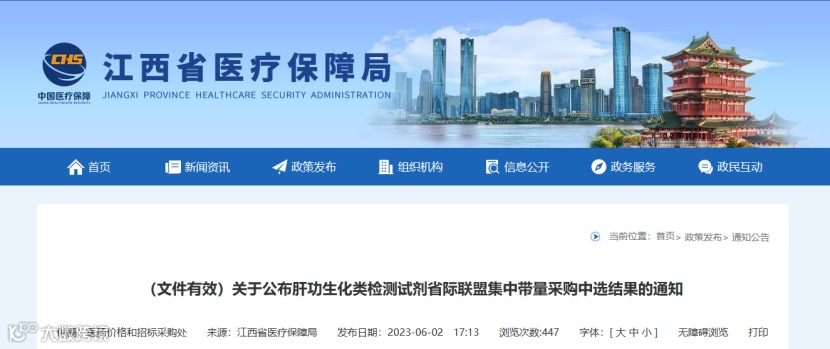 2023年6月2日,江西医保局发布《关于公布肝功生化类检测试剂省际联盟集中带量采购中选结果的通知》,公布了肝功生化类检测试剂省际联盟集中带量采购中选结果及肝功生化类检测试剂省际联盟集中带量采购中选供应清单。