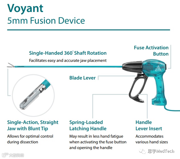 Voyant是一款高级双极电刀,和美敦力Ligasure一样能够收集有关其钳口内组织性质的信息,在施加能量时快速持续地测量组织,并进行调整以在整个密封周期中提供最佳能量,以形成永久的融合。Voyant能够闭合的最大血管直径为7mm。
