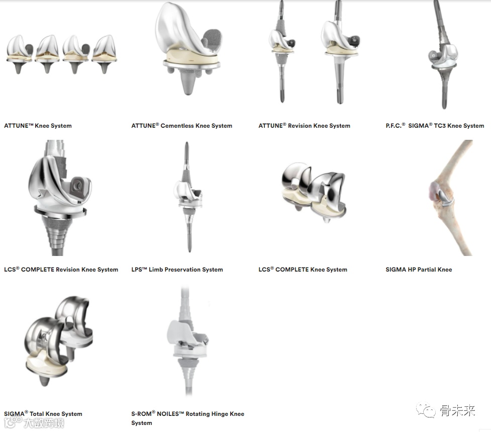 该公司提供了众多膝关节植入物产品,其中包括ATTUNE®非骨水泥膝关节植入物、ATTUNE™内侧稳定膝关节系统、ATTUNE®翻修膝关节系统、P.F.C.® SIGMA® TC3 膝关节系统、LCS® COMPLETE翻修膝关节系统、LPS™ 肢体保护系统、LCS® COMPLETE 膝关节系统、SIGMA HP 部分膝关节、SIGMA®全膝关节系统、S-ROM® NOILES™旋转铰链膝关节系统等。