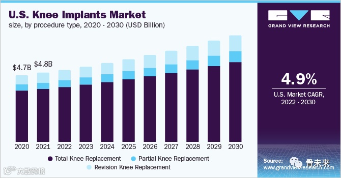 膝关节植入物市场具有广阔的潜力。2021年,全球膝关节植入物的市场规模为107亿美元,预计2022年达到112亿美元。从2022年到2030年,全球膝关节植入物市场预计将以5.7%的复合年增长率增长,市场规模在2030年将达到174亿美元。