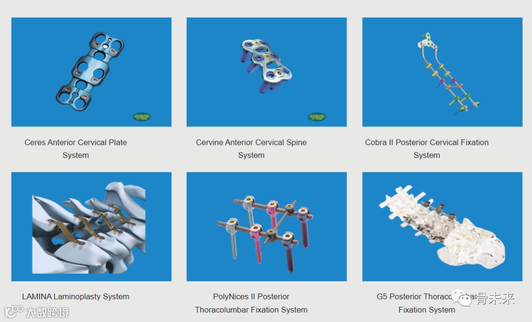 美敦力主要的脊椎治疗产品众多,包括Kyphon™气囊后凸成形术平台、Kyphon V™ Premium椎体成形术平台、Vertex®重建系统、Prestige LP颈椎间盘系统、CD HORIZON SOLERA脊柱内固定系统、CAPSTONE产品、美敦力CRESCENT产品等等。部分产品占据了脊椎市场较大份额。
