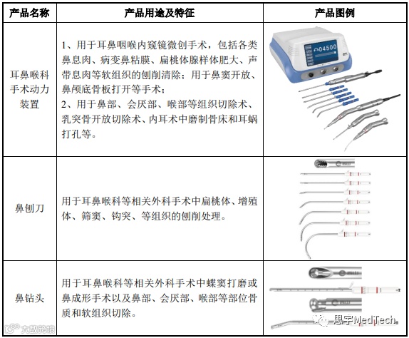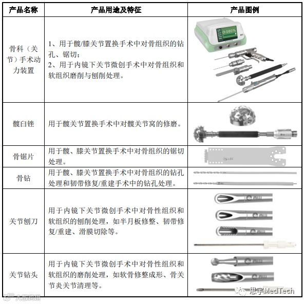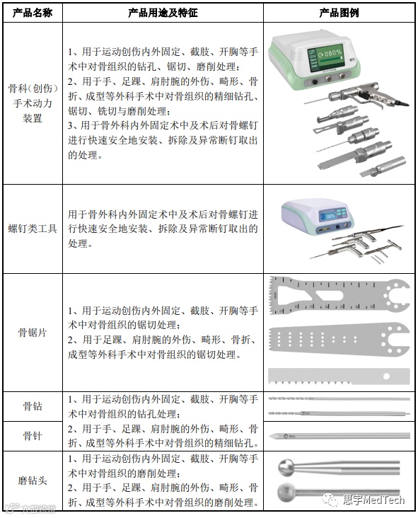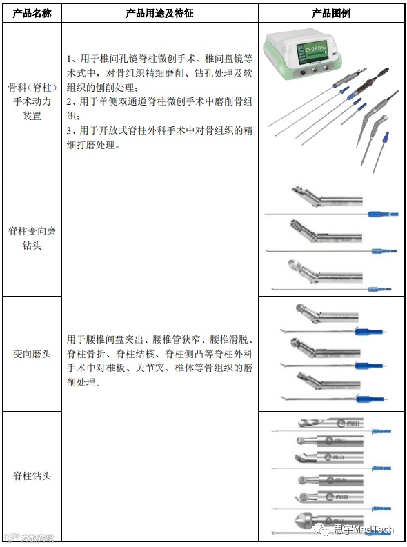 公司专注于外科手术医疗器械,特别是微创外科手术医疗器械领域,主要产品手术动力装置包括整机、耗材及配件,主要用于外科手术,特别是微创外科手术中对骨组织、软组织的切除、磨削、刨削、锯切、铣切、修整等。西山科技现有产品如下: