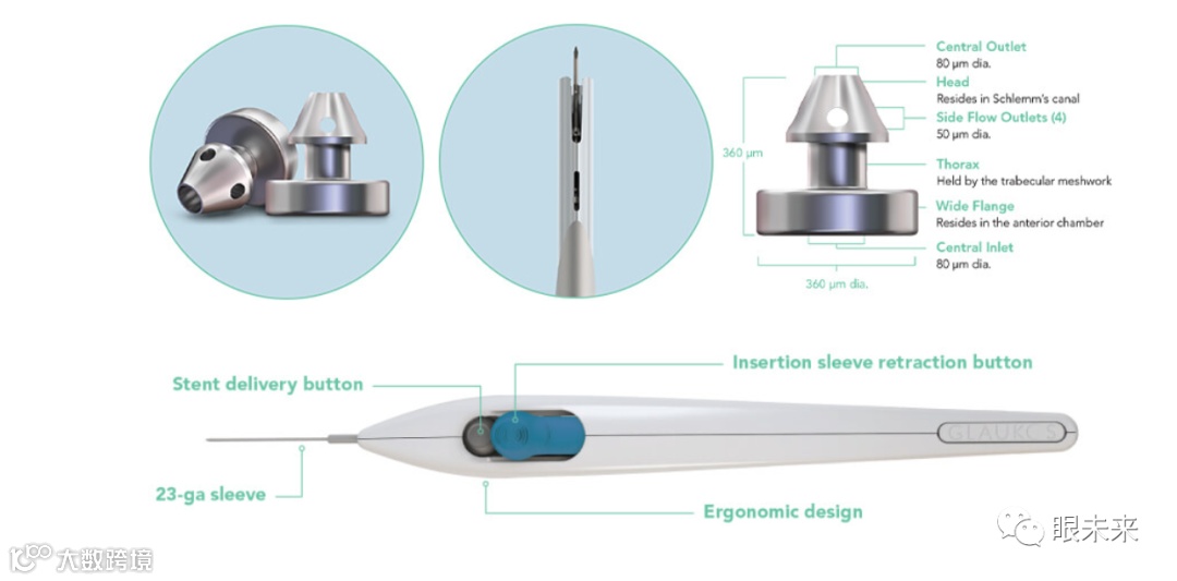 iStent infinite的支架高度为1/3mm,形状类似子弹,尖端有4个大小分布均匀的小孔用来引流房水,通过小梁网进入Schlemm氏管。iStent infinite使用1个自动注射系统携带3个支架,可以通过1个切口同时植入,从而减少进出眼内次数和对眼部结构的破坏,以及减少相应的并发症。