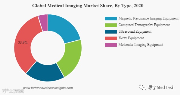 按设备类型,2020年X射线设备占比最高,约33%市场份额(主要源自使用C型臂进行术中图像引导的市场需求),其次是MRI设备,CT设备,超声设备和分子成像。