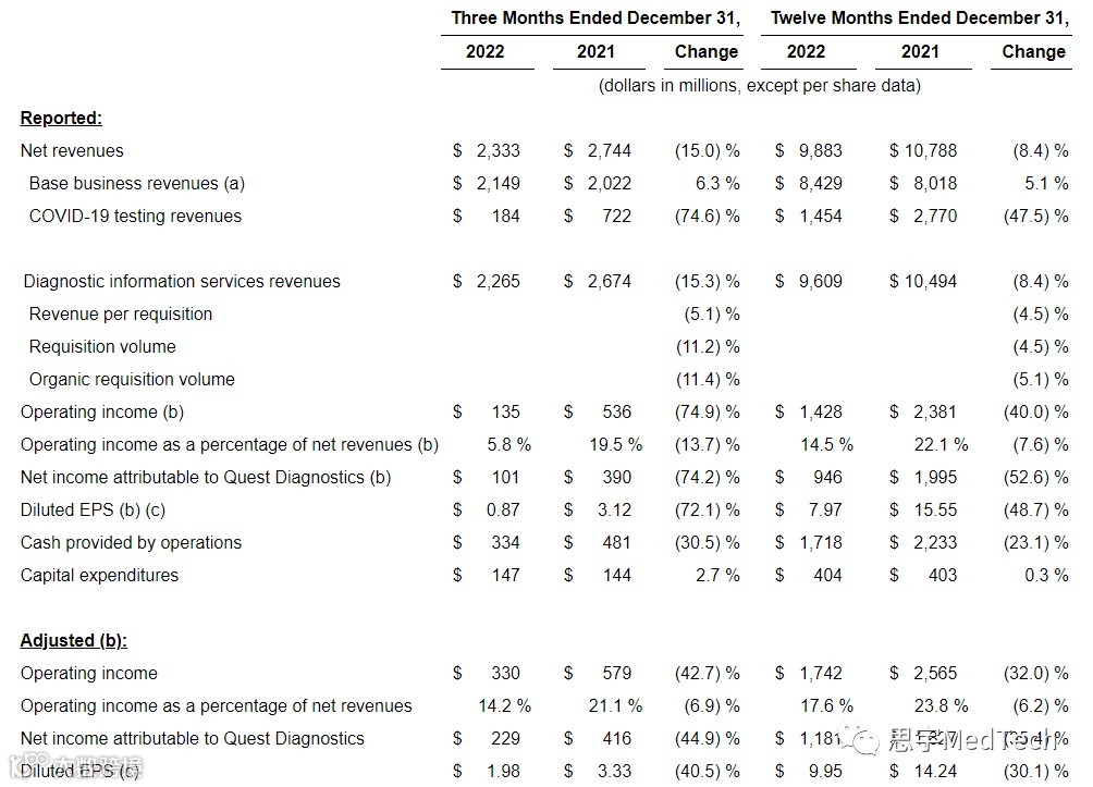 近期,奎斯特诊断公司(Quest Diagnostics)公布第四季度业绩和2022年全年业绩。财报显示,公司第四季度销售收入为23.3亿美元,同比下降15.0%;基本业务收入为21.5亿美元,同比增长6.3%;新冠测试收入为1.84亿美元,同比下降74.6%。