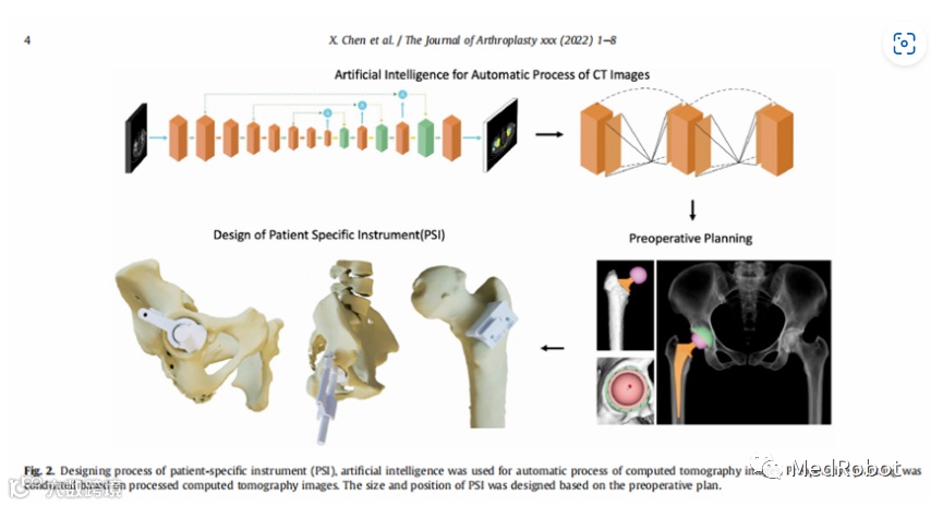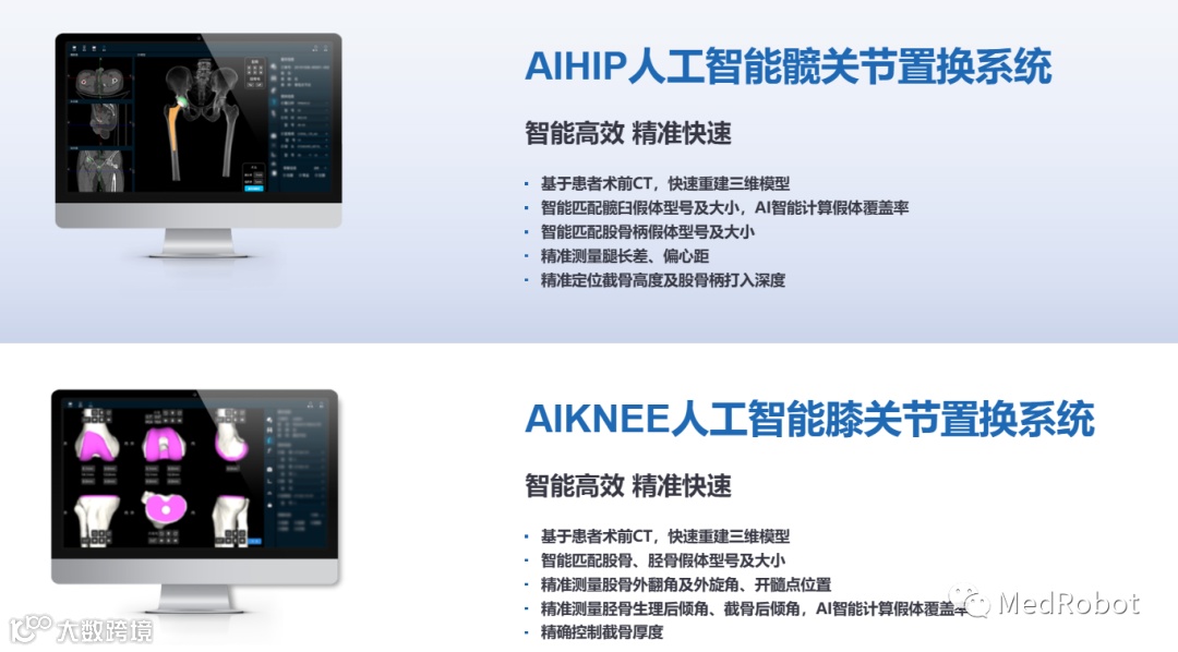 AIJOINT将关节置换数字化,辅助关节置换三维手术解决方案,为骨科关节医生提供覆盖术前规划、术中导肮和术后随访全流程的关节置换解决方案。据公司官网报道:“AIJOINT-iPSI®人工智能THA组,30位患者接受了基于CT的AIJOINT®人工智能术前三维医学影像重建,iPSI ®智能导板的设计是根据患者个体情况,运用人工智能对计算机断层图像进行自动处理,在术前基于处理过的计算机断层扫描图像,精确iPSI®的大小和位置。传统THA组,30位患者接受了基于CT的AIJOINT®人工智能术前三维医学影像重建,并接受了Free-hand(传统)的THA手术。”