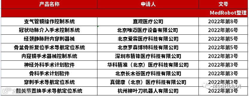 MedRobot今日盘点2022年已提交资料并进入NMPA创新通道的手术机器人相关的医疗器械。范围为文号2022年第1号-第9号(第9号为2023年1月公示)。由于公示文件仅有申请人、产品名称(下文红色部分),且产品未上市,我们查询的内容有可能不准确,仅供读者们参考。