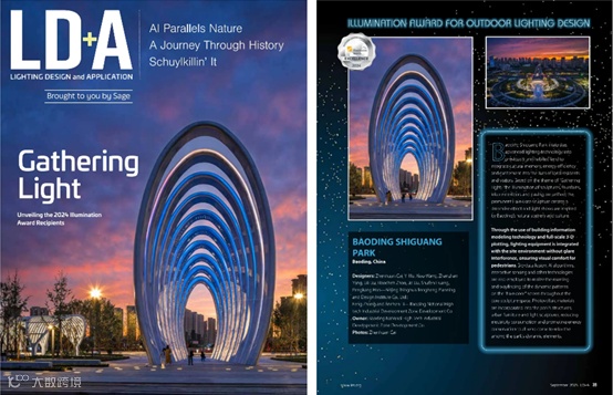 “深秋迟暮·新冬可期”,贝塔智能携手清华同衡规划设计研究院、保定国家高新技术产业开发区发展有限公司、北京海兰齐力照明设备安装工程有限公司,共同谱写了照明设计领域的一段辉煌篇章!我们共同参与设计的保定拾光公园照明设计项目,在全球照明设计中荣获美国第51届IES(Illuminating Engineering Society)年度照明奖-卓越奖,还荣获中国第19届中照奖一等奖,同时拾光公园的照明设计作品成功登上了美国知名照明设计杂志《LD+A》9月刊的封面。这不仅是一份荣耀,更是向全球照明设计界展示了中国设计的独特魅力和无限可能。