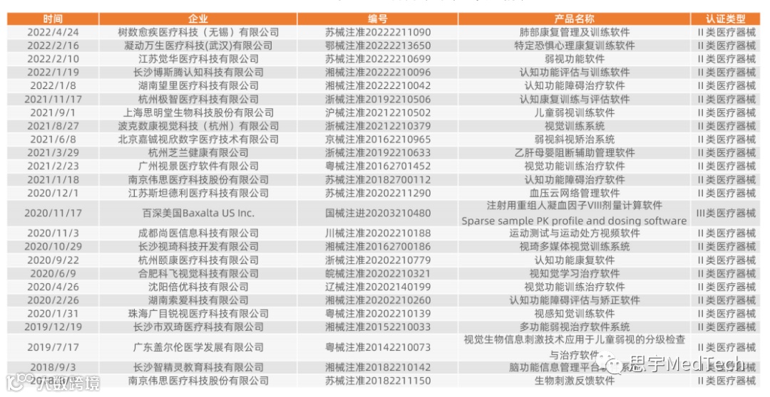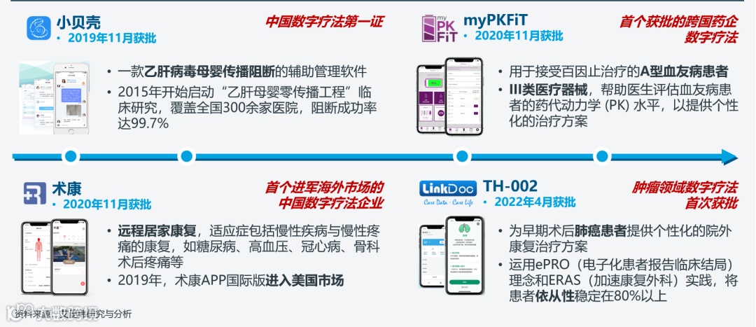 相比于发展迅速的全球市场,中国第一款数字疗法产品(芝兰健康旗下的小贝壳,用于乙肝病毒母婴传播阻断的辅助管理软件)在2019年11月正式获批为医疗器械。此后,包括术康、武田myPKFiT、众曦医疗(零氪旗下)TH-002等数字疗法产品的成功获批也代表了不同阶段的里程碑。