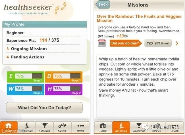 Ayogo公司专为糖尿病患者以及易患糖尿病的儿童而设计了一款名为HealthSeeker的Facebook游戏软件。这款游戏基于Facebook平台,不仅有很大的用户群体,还形成了既有竞争又能互动反馈的良性社交圈。HealthSeeker会用“生活经验”点数或虚拟物品奖励改善生活习惯的糖尿病玩家,这些细致的活动帮助用户形成健康的生活习惯,达到慢性病管理的效果。