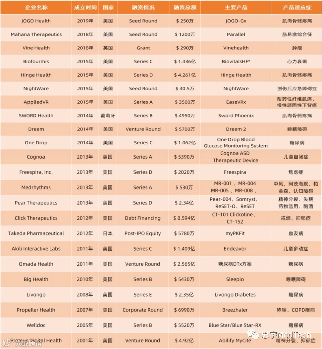 在海外,这一领域已成长起了Pear Therapeutics、Akili等头部玩家。附动脉网整理的部分FDA认证的数字疗法。